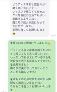 ピラティスは継続することでお身体の変化を実感しやすくなりますので、これからもしっかりサポートさせていただきます。次回またお会いできるのを楽しみにお待ちしております。
